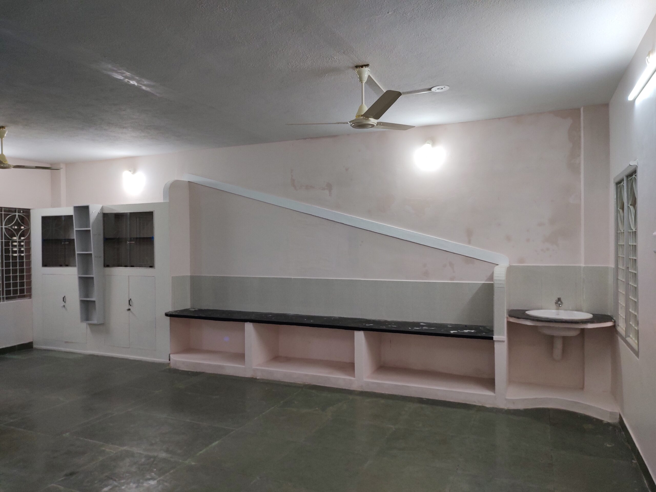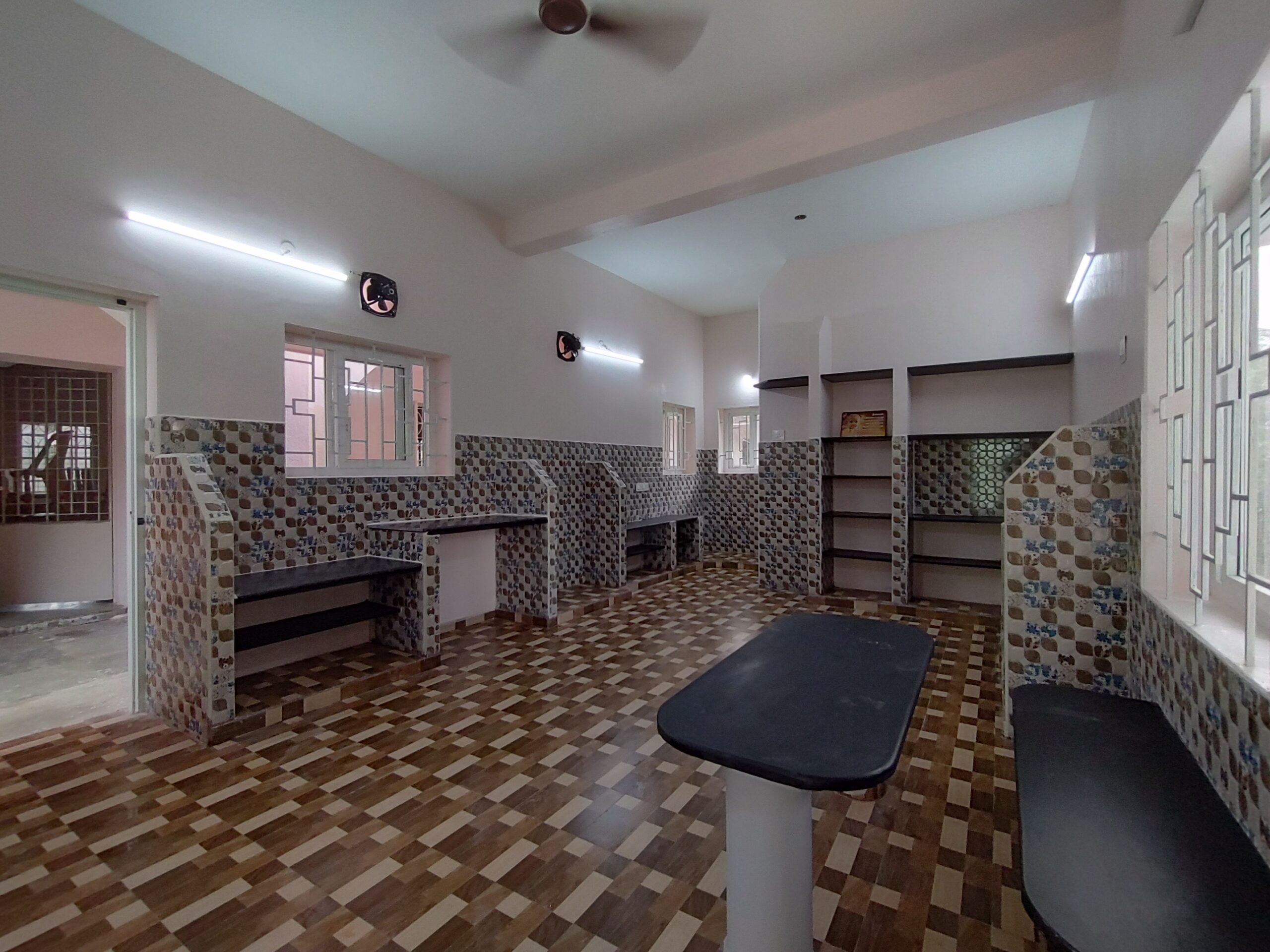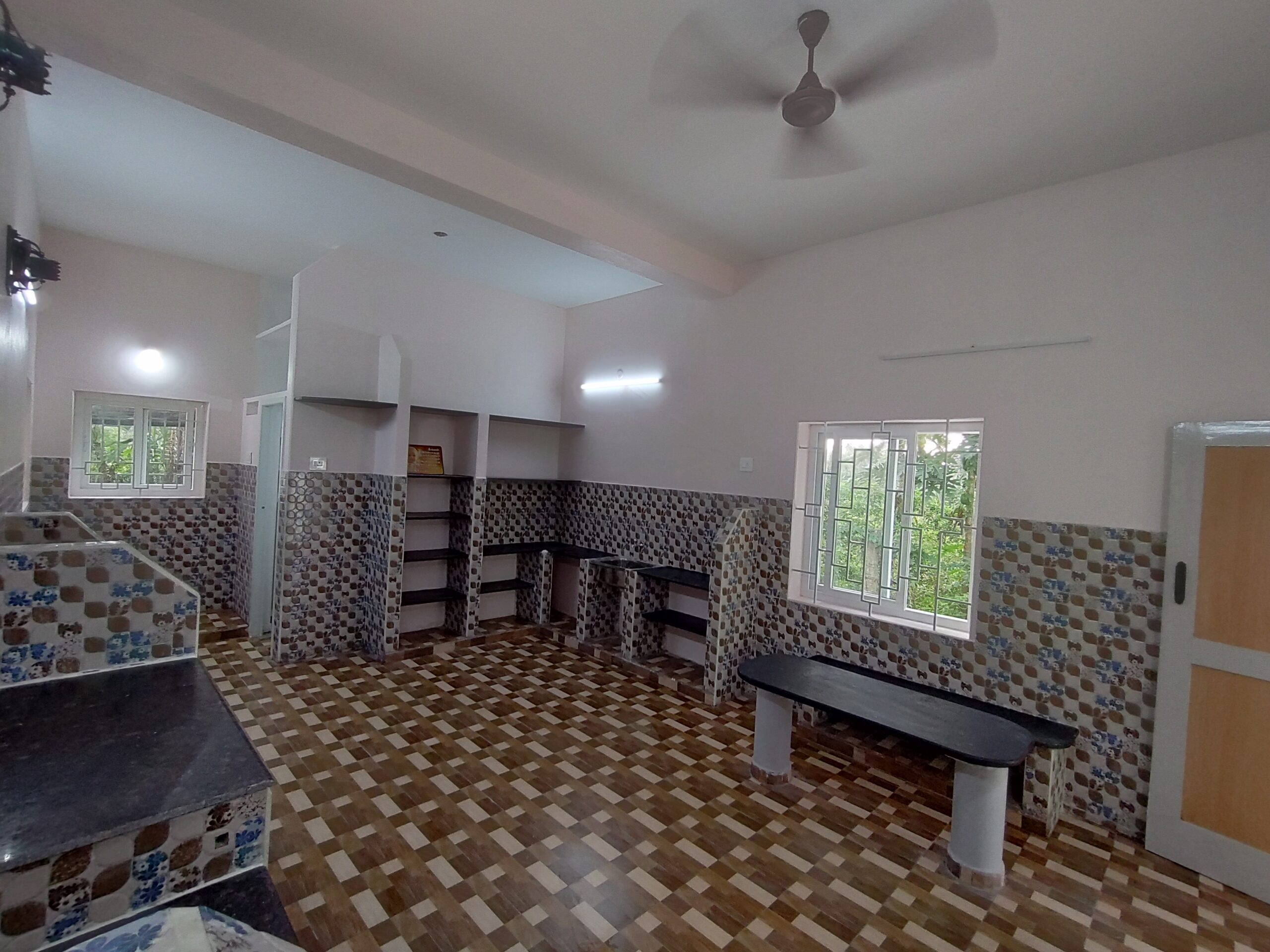 This project involved transforming an existing facility through structural modification, interior redesign, and functional space upgrades. The work included demolition of selected walls, creating new openings, reworking the layout, and integrating modern finishes. Custom kitchen counters, shelving units, tiled surfaces, and work platforms were constructed to improve utility and aesthetics. Electrical upgrades, new ventilation systems, and fresh plastering and flooring were also executed. The finished interior showcases a mix of patterned tiles, granite/tandoor worktops, planned storage units, and ample natural lighting. The renovation successfully merged functionality with visual appeal while working within the constraints of an active building.